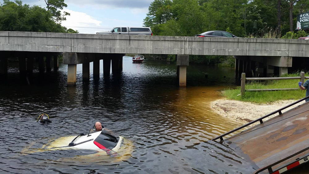 The Escambia County Sheriff’s Office Dive Team and Escambia Fire Rescue worked to search the bayou of Lillian Highway and Dog Track Road to make sure there was not a victim in the water. Members of the dive team were able to get the tag number from the vehicle, and deputies contacted the owner. She had reportedly been trying to sell the vehicle and had left it with a window down and keys in the ignition.