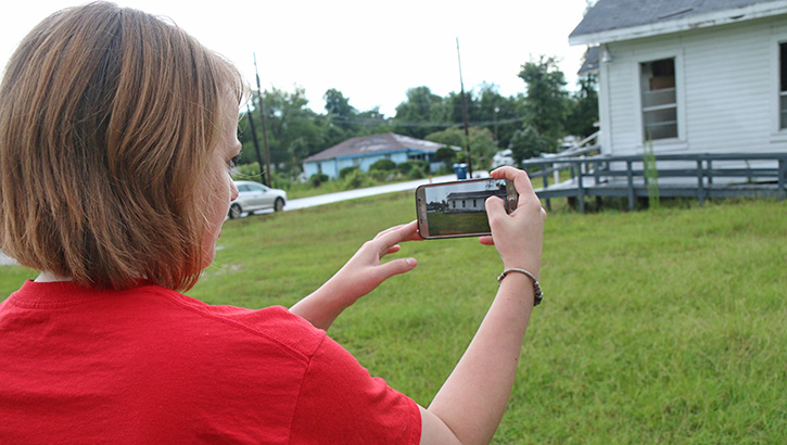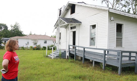 Pictured top: Republic Congressional candidate Rebekah Johansen Bydlak addressed the Century Town Council Monday night. Pictured inset: Council member Gary Riley listens to Bydlak speak. Pictured below: Bydlak toured the tornado damaged areas of Century prior to speaking to the town council, including this stop at the Wesley Chapel on Jefferson Avenue. NorthEscambia.com photos, click to enlarge.