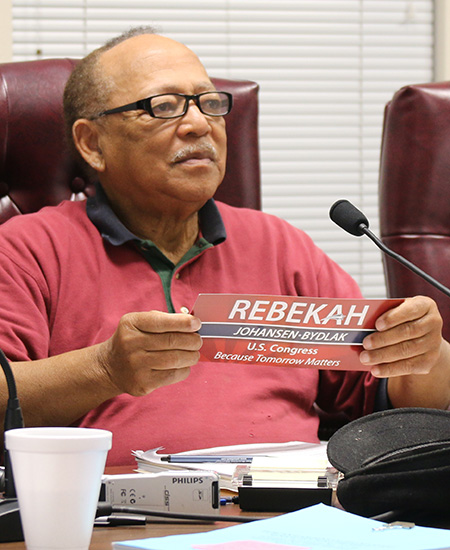 Republic Congressional candidate Rebekah Johansen Bydlak addressed the Century Town Council Monday night after touring areas of Century for a first-hand look at the devastation that was caused by the EF-3 tornado that struck the town on February 15.