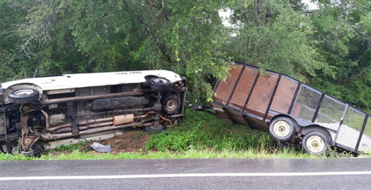 ‘The van and trailer overturned after the driver lost control. There were no serious injuries.