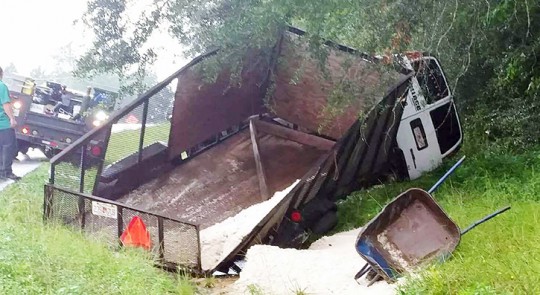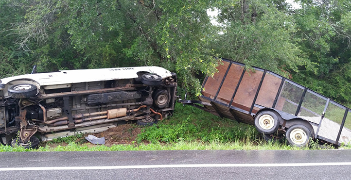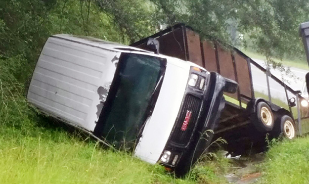 The overturned van reportedly leaked a quantity of fuel into a ditch. However, the trailer that was being towed by the van contained sand, which spilled and formed a dam for the fuel.
