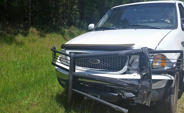 The 1996 Dodge Ram driven by Myrick was identified by a piece of the front grill left behind at the crash scene with a chrome skull with two guns mounted to the front.