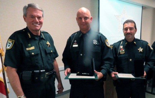 Pictured: The Medal of Courage was presented Thursday to Deputy 1st Class Walt Shiver (middle), Lt. Marc Dewees, and Deputy Kyle Haver (not pictured) by Sheriff David Morgan (left). Photo courtesy Escambia County Sheriff’s Office for NorthEscambia.com, click to enlarge.