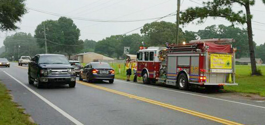 Escambia Fire Rescue and Escambia County EMS units are standing by in school zones across the county with lights flashing to remind drivers to slow down during the first week of school. Pictured: A volunteer crew from the Beulah Station of Escambia Fire Rescue Wednesday morning in the Beulah Elementary School Zone. Photos for NorthEscambia.com, click to enlarge.