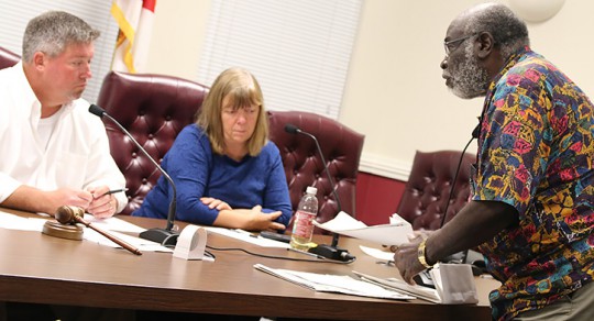 Pictured top and inset: Resident David Knight warns the Town of Century to say off his property during a Monday night council meeting. NorthEscambia.com photos, click to enlarge.