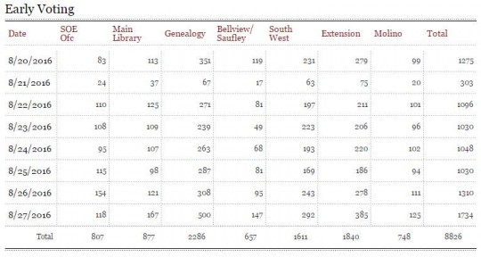 There 8,826 early votes cast — up 32 percent over 2012 and up 103 percent over 2014. The overall early voting, vote by mail turnout was 13 percent.