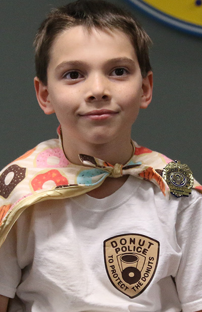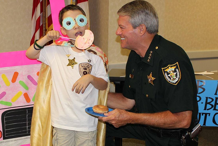 He learned that there are just over 400 sworn officers in the Escambia County Sheriff’s Office, and he composed a letter to the Krispy Kreme on 9th Avenue asking for a discounted bulk price. The store manager instead donated 420 doughnuts to the project. Tyler, dressed in a superhero doughnut cape, delivered the doughnuts to Sheriff David Morgan and his department.