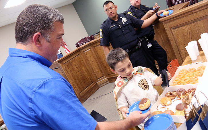 “I like cops because they are the best and they are my friends and they like one of my favorite dessert — doughnuts, he said. “They wear blue and green and those are two of my favorite colors. I like drinking coffee and they like coffee too it helps them stay awake when they have to work all night long to keep us safe.”