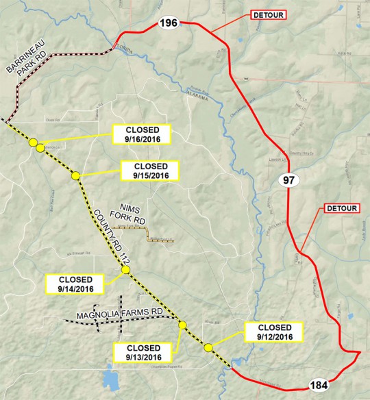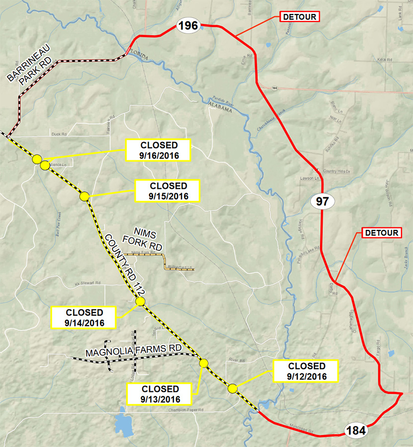 The closures will be between Barrineau Park Road and the Florida state line from Monday, September 12 to Friday, September 16 for drainage improvements. The closures will be from 7:30 a.m. until 5 p.m. each day.