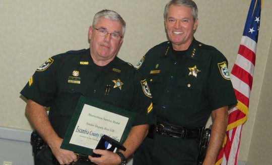 Pictured: Senior Deputy Ronnie Gill (left) was presented the Escambia County Sheriff’s Office Meritorious Service Medal by Escambia County Sheriff David Morgan. Photo for NorthEscambia.com, click to enlarge.