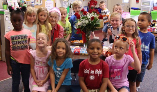 Pictured: Molino Park Elementary School volunteer “Granny”, Mrs. Lillian Adell Ward, passed away Wednesday. Pictured below: Granny Ward celebrates her birthday with Molino Park students last May. Photos by Kim Stefansson for NorthEscambia.com, click to enlarge.