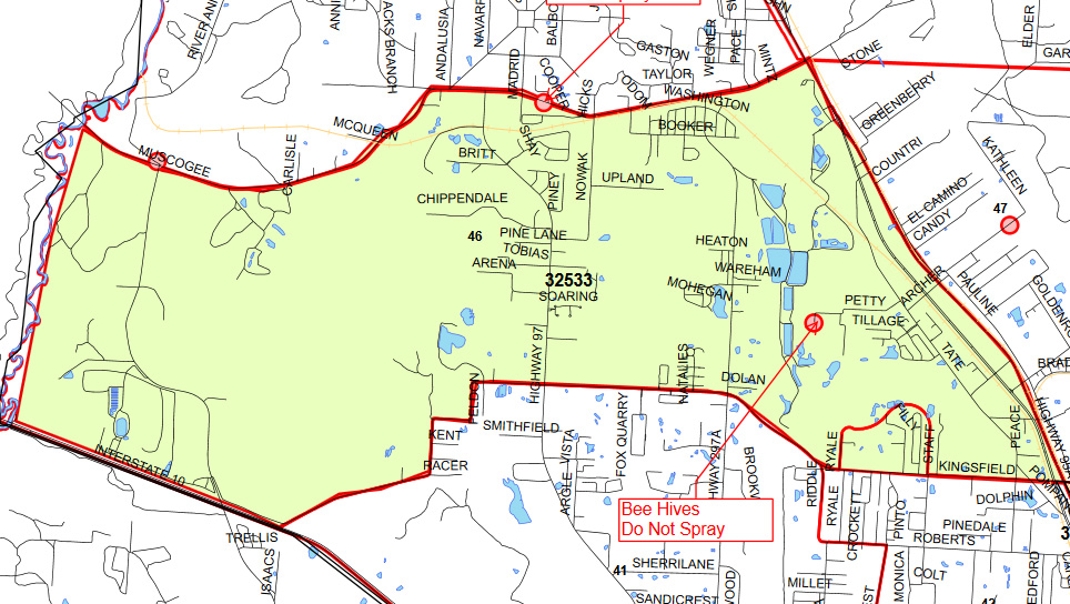 South Carolina used aerial spraying during daylight hours when bees are active. Escambia County does not have aerial operations and only does fogging after 6 pm when bees have gone to their hive. Anyone that has honeybees can call them and they will set up a no spray zone as you see in the map.