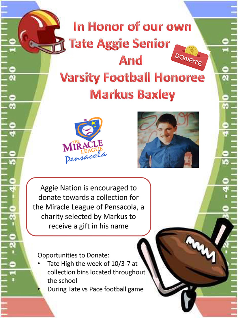 Tate High School students are collecting a donation this week for the Miracle League in honor of senior and varsity football honoree Markus Baxley. Collection bins are located throughout the school, and donations will be accepted during the Pace at Tate football game Friday night.