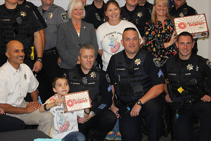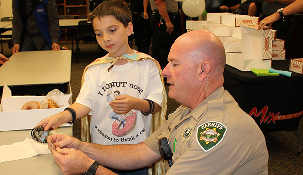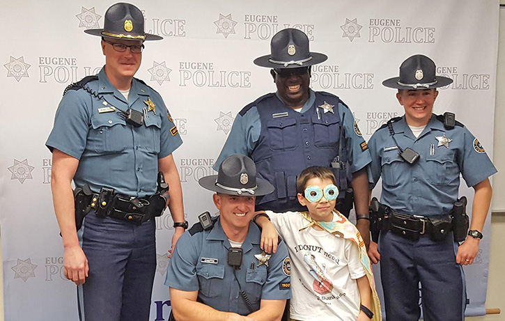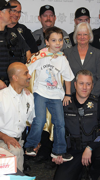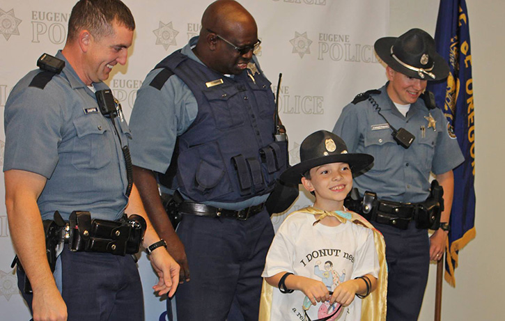 He flew across country late last week in his first plane ride ever to thank law enforcement in Oregon. Tyler, 8, met and shared doughnuts with the Eugene (OR) Police Department, the Springfield (OR) Police Department, Lane County Sheriff’s Office and the Oregon State Police, thanks to radio station 94.5 Mix FM.