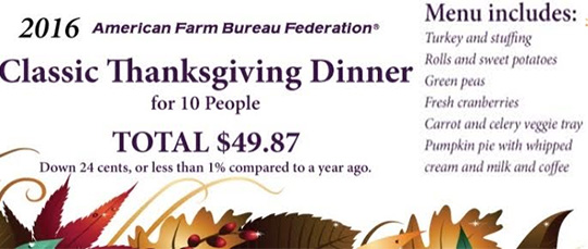 The stable average price reported this year by Farm Bureau for a classic Thanksgiving dinner tracks closely with the government’s Consumer Price Index for food eaten at home. The most recent CPI report for food at home showed just over a 2-percent decline over the past year.