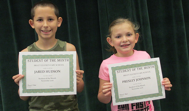 The students pictured below, Jared Hudson and Presley Johnson, were chosen to represent Bratt Elementary School as Escambia County Students of the Month for November.