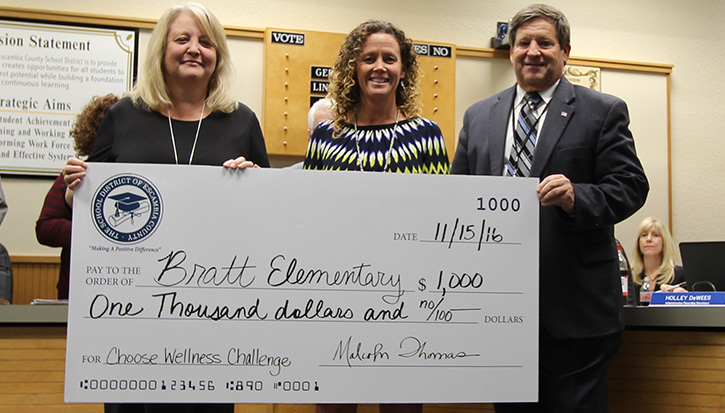 For the second consecutive year, Bratt Elementary School has been named the winner of Escambia Superintendent Malcolm Thomas’ Choose Wellness Challenge. The school was presented a $1,000 prize at Tuesday’s meeting of the Escambia County School Board.