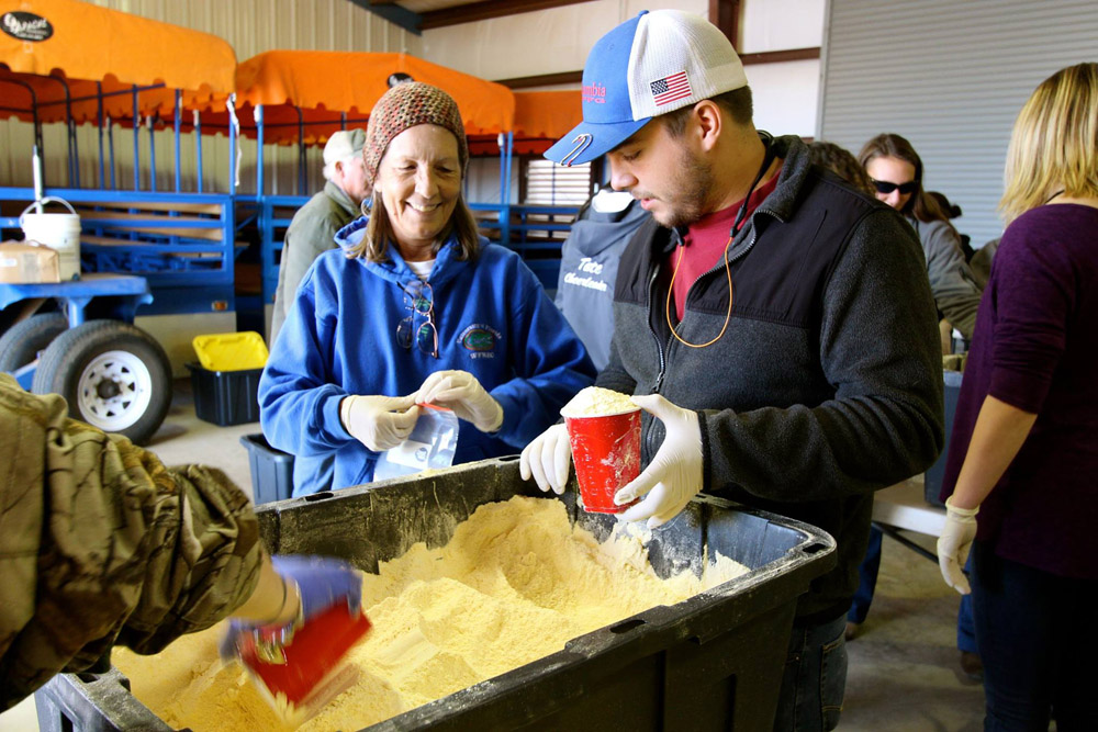 The FFA students from Northview High School, Tate High School, Jay High School, along with other schools and boy scouts harvested collards and cabbages and sorted over a ton of donated sweet potatoes. The students also bagged freshly ground corn meal and grits.
