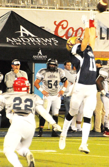 Pictured top: Tate’s Jake Henry (#17) with pass for the West. Pictured inset: Northview’s Luke Ward reaches for a catch for the West. Pictured below: Northview’s Ohijie Elliot in pursuit for the West. Photos by Andrew Garner/Atmore Advance for NorthEscambia.com, click to enlarge.