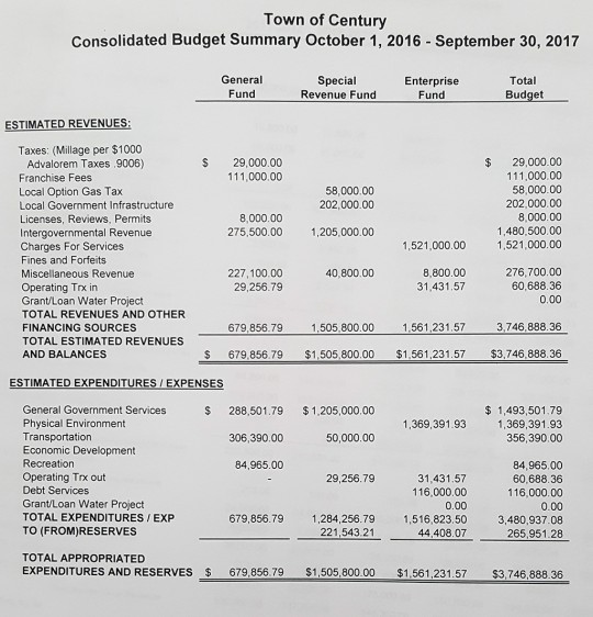 Pictured top: Century’s accountant, Robert Hudson explains the town’s budget to council members Monday night. Pictured below: The tentative budget summary, click to enlarge. NorthEscambia.com photos.
