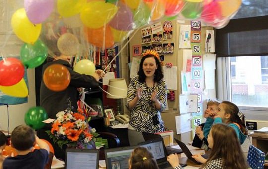 The campus was decorated with signs and balloons to welcome Brown, and a balloon drop awaited her in her classroom.