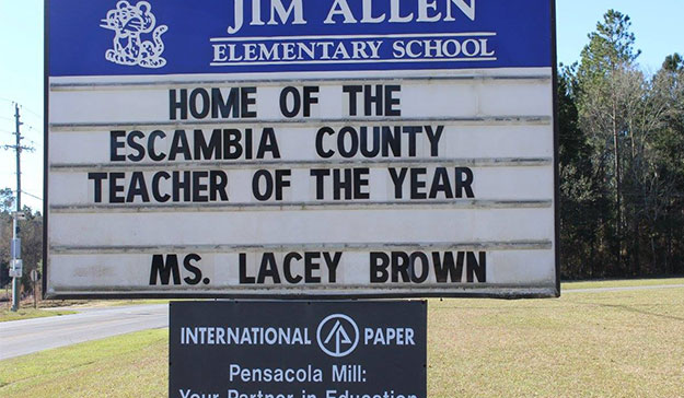 Escambia County School Superintendent Malcolm Thomas joined Jim Allen Elementary School in welcoming teacher Lacey Brown to campus Monday morning. Brown was named the Escambia County School District Teacher of the Year Saturday night.