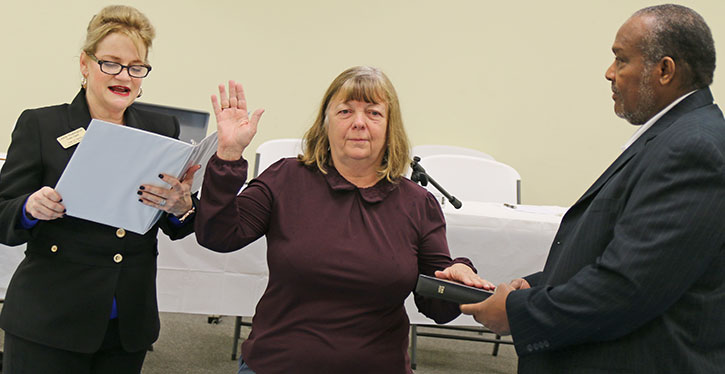 Pictured top: Henry Hawkins (center) is sworn in as mayor of Century Monday night by Town Clerk Leslie Howington as Bishop Russell Fountain holds the Bible. Pictured bottom: Ann Brooks (center) is sworn into office for a third term. Pictured inset: Hawkins at the council table. NorthEscambia.com photos, click to enlarge.