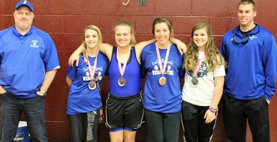Five members of the Jay High School ladies weightlifting team competed last week in Baker and advanced to regionals at Choctaw High School on Wednesday. They are (L-R) Trinity Palmer, sixth in her division; Kara Douglas, sixth in her division; Haven Target, fourth in her division; Haylee Watson, district champion in her division. Also pictured are their coaches, Melvin Kersey (left) and Hunter Wyrdoisk. Not pictured is Trinity Palmer, who placed fifth in her division.