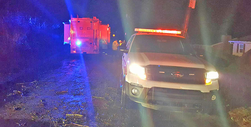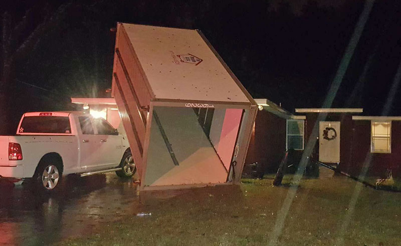 The storms about 4 a.m. downed trees and power lines and tossed small items, blocking roads. Trees were down on a few homes, causing minor damage to those structures. One home had a “storage pod” trailer tossed onto its roof.
