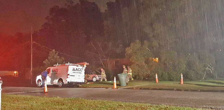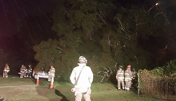 A tree fell onto a house on Flagler Driver Friday night, bringing down power lines. Neighbors said the elderly couple inside the home was able to make it out safely. At one point, the live power line sparked a small fire in the tree’s branches. NorthEscambia.com photos by Kristi Barbour, click to enlarge.