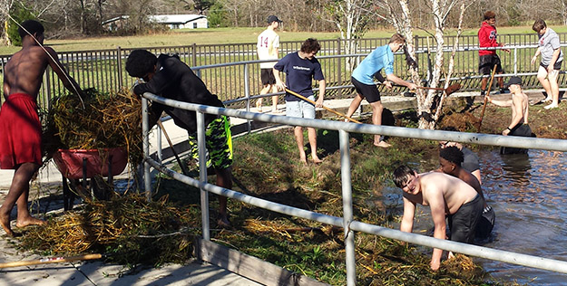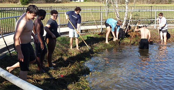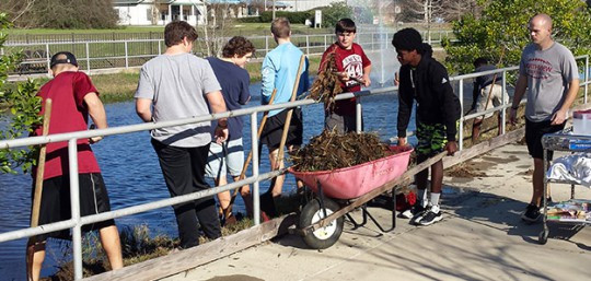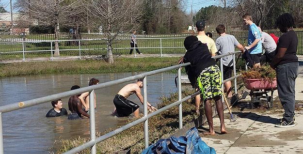 Members of the Northview High School Chiefs football team volunteered Saturday morning at the Century Health and Rehabilitation Center. The cleaned out both around and in the fishing pond, and cleaned up and cleared out around the center’s courtyard.