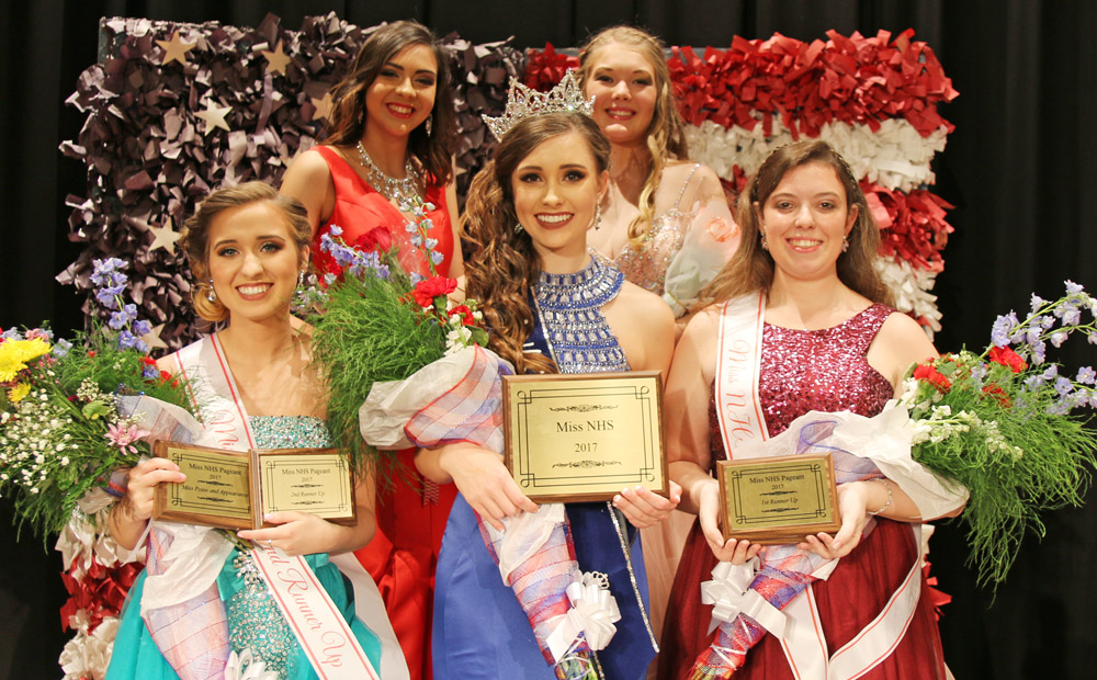 Pictured top: Top 5 members Ashton Carnley (left) and Hadley Woodfin, (bottom) second runner-up Morgan Myrick, Miss NHS 2017 Ashlan Harigel and first runner-up Brianna Smith. Pictured inset: Harigel reacts to being named Miss NHS 2017.