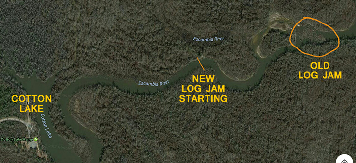 Pictured above and below: Photos for NorthEscambia.com show a new jog jam blocking the Escambia River north of Cotton Lake. Pictured bottom: A map of the log jam location. NorthEscambia.com images, click to enlarge.