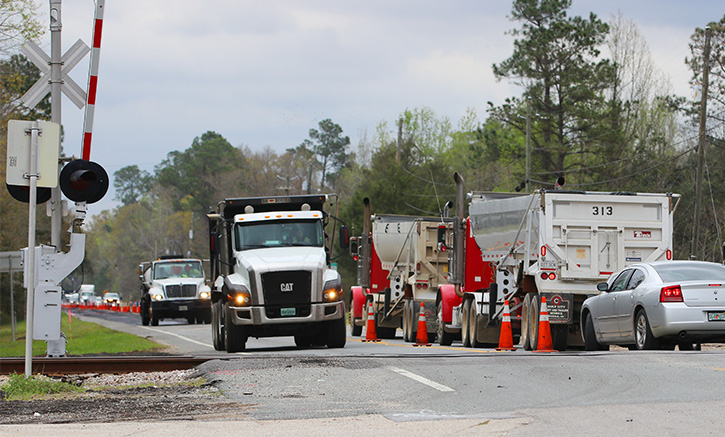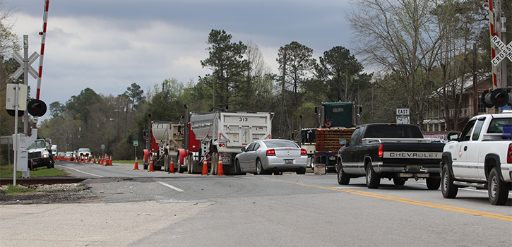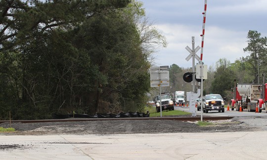 A temporary onsite diversion (pictured left) has been constructed to route traffic around the railroad reconstruction work. Law enforcement will be on site to assist with traffic control once the railroad crossing traffic is shifted.