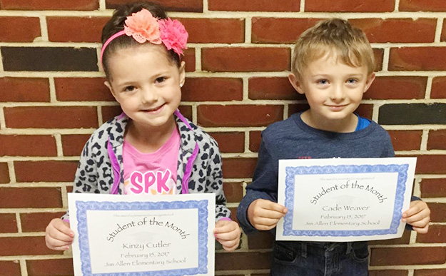 Jim Allen Elementary School has named Students of the Month for February. They are Kinzy Cutler (left) and Cade Weaver. Courtesy photo for NorthEscambia.com, click to enlarge.