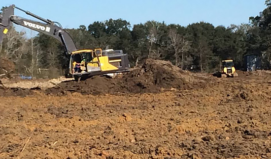 Work to construct one of eight stormwater retention ponds is underway. Pictured left, heavy equipment is used to clear trees and other vegetation.