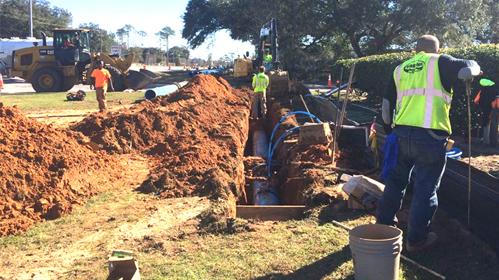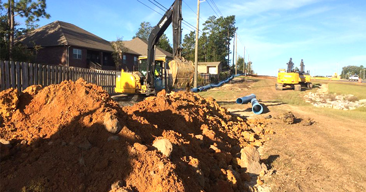 Pictured below, crews are working to install a new 16-inch water main along the south side of Nine Mile Road, adjacent to the Nature Trail subdivision. The new water main must be installed and the existing water main must be taken out of service so the new eastbound roadway can be constructed.