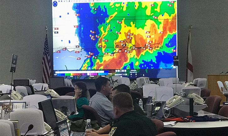 As potentially severe weather moved through the area Monday morning, the Escambia County Emergency Operations Center was activated at a Level 2, or partial evacuation. That allowed county staff to be r eady to respond in case severe weather impacted the area. It also allowed staff to monitor the storm and be ready in the event of an emergency. In a partial activation, only specific emergency support functions under the county’s emergency plan are called in. Photo for NorthEscambia.com, click to enlarge.