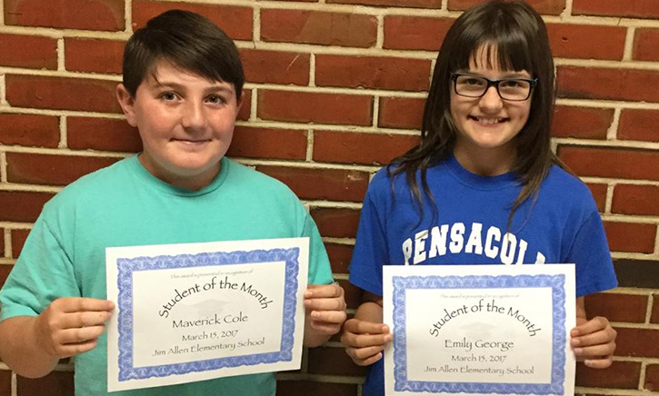 Jim Allen Elementary School has named Students of the Month for March. They are Maverick Cole (left) and Emily George. Courtesy photo for NorthEscambia.com, click to enlarge.