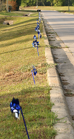 Blue pinwheels line Industrial Boulevard in Century, leading from Highway 4 to the Camp Fire Century Youth Learning Center. April is Child Abuse and Neglect month. In recognition, Camp Fire lined the street with blue and white pinwheels because “there’s no excuse for child abuse”. NorthEscambia.com photos, click to enlarge.