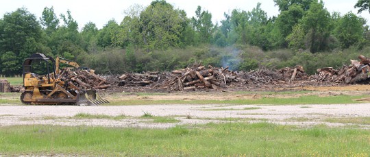 The downed trees and limbs were transported to an empty lot in the town’s industrial park. Piles were created for burning out of about 800 dump truck loads of trees and other vegetative debris from the tornado.