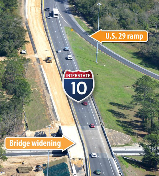 Work on the I-10/U.S. 29 interchange improvements is currently focused on widening on both the interstate and U.S. 29. Scroll down for an aerial tour of the construction activities.
