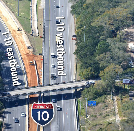Above: An aerial view of I-10 and U.S. 29 near the interchange. In the bottom center, crews are working off the roadway to construct what will be the new “Exit 10” from I-10 westbound to U.S. 29. Drivers traveling from I-10 westbound to U.S. 29 south will utilize a new traffic signal on U.S. 29. Drivers traveling from I-10 westbound to U.S. 29 north will bypass the new signal and merge onto U.S. 29.