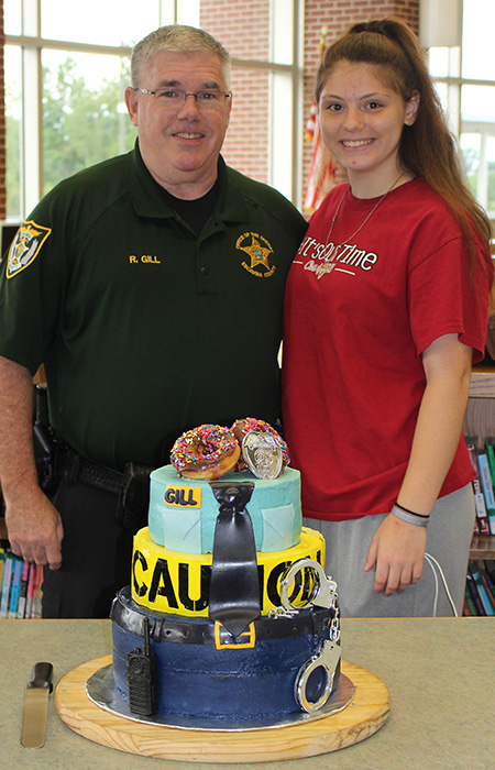 Last week, Ernest Ward Middle School, Northview High School, and the Escambia County Sheriff’s Office celebrated his retirement (read more). Wednesday, the last day of school, the members of the EWMS Teens for Christ surprised Gill with another retirement party. The students were treated to a sermon and Deputy Gill treated to handmade cards, gifts and a special cake created by student Naudia Carach and her grandmother.