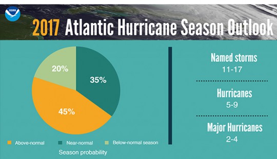 “The outlook reflects our expectation of a weak or non-existent El Nino, near- or above-average sea-surface temperatures across the tropical Atlantic Ocean and Caribbean Sea, and average or weaker-than-average vertical wind shear in that same region,” said Gerry Bell, Ph.D., lead seasonal hurricane forecaster with NOAA’s Climate Prediction Center.