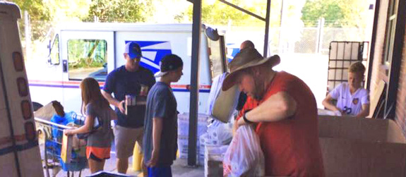 Pictured: Volunteers unload food as it arrives at the Cantonment Post Office. Photos for NorthEscambia.com, click to enlarge.