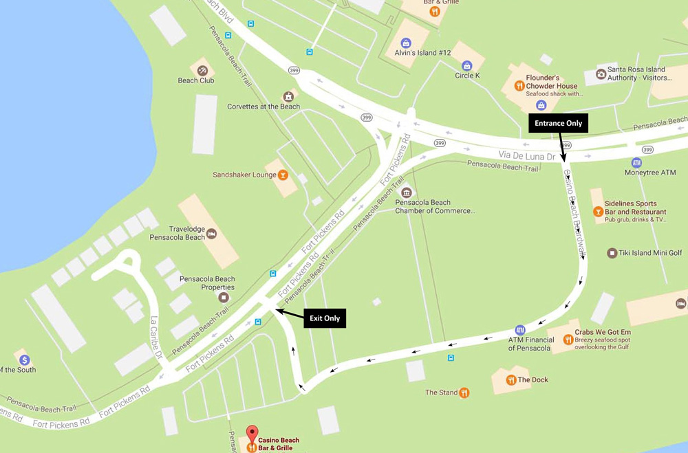 Beginning Saturday, May 13 access into and exiting the Casino Beach parking lot along Via De Luna Drive and Fort Pickens Road will be modified.