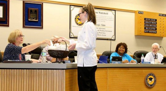 The Northview High School Culinary Arts Academy made a presentation Thursday to the Escambia County School Board. They also delivered oatmeal pecan chocolate chip cookies to board members, staff and other guess. Pictured below (L-R) and Northview High Principal Gayle Weaver, culinary academy members Jordan Parham, Lari McCann, Laura Kinley, and Victoria Amerson, and instructor Vicki Cook. Photos for NorthEscambia.com, click to enlarge.