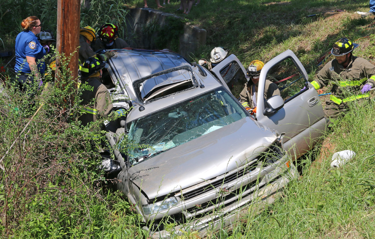 The Suburban left the roadway, struck a sign, entered a deep ditch and overturned several time. The roof of the vehicle hit a utility pole before the vehicle came to rest upright in the ditch. Two people in the Suburban were trapped until being extricated by firefighters. One male, a backseat passenger, was trapped until firefighters were able cut off and remove the roof from the vehicle.