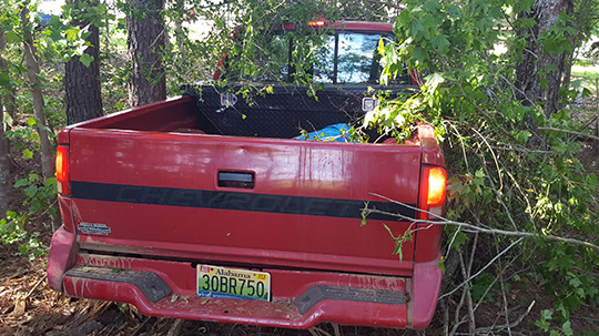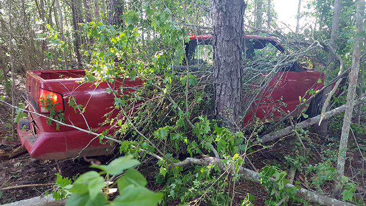 A passerby spotted the pickup in a small wooded area about 4:00 p.m. on Pine Forest Road, just northeast of Pelt Road. The driver was no longer around the vehicle, and it was apparent that the accident had happened earlier.